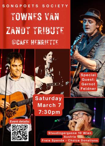 March 7 is Townes Van Zandt's birthday, and we, the Songpoets Society, are celebrating this with an evening performing his songs. We'll dig deep into the catalogue of this cult-hero of songwriters, and we are proud to present a special guest for the evening, Gernot Feldner, who will help extend this menu of beautiful Americana with his own interpretations of Townes' tunes. Expect a musical programme full of gritty, existential, poetic, hard truths the way only Townes could have written 'em.