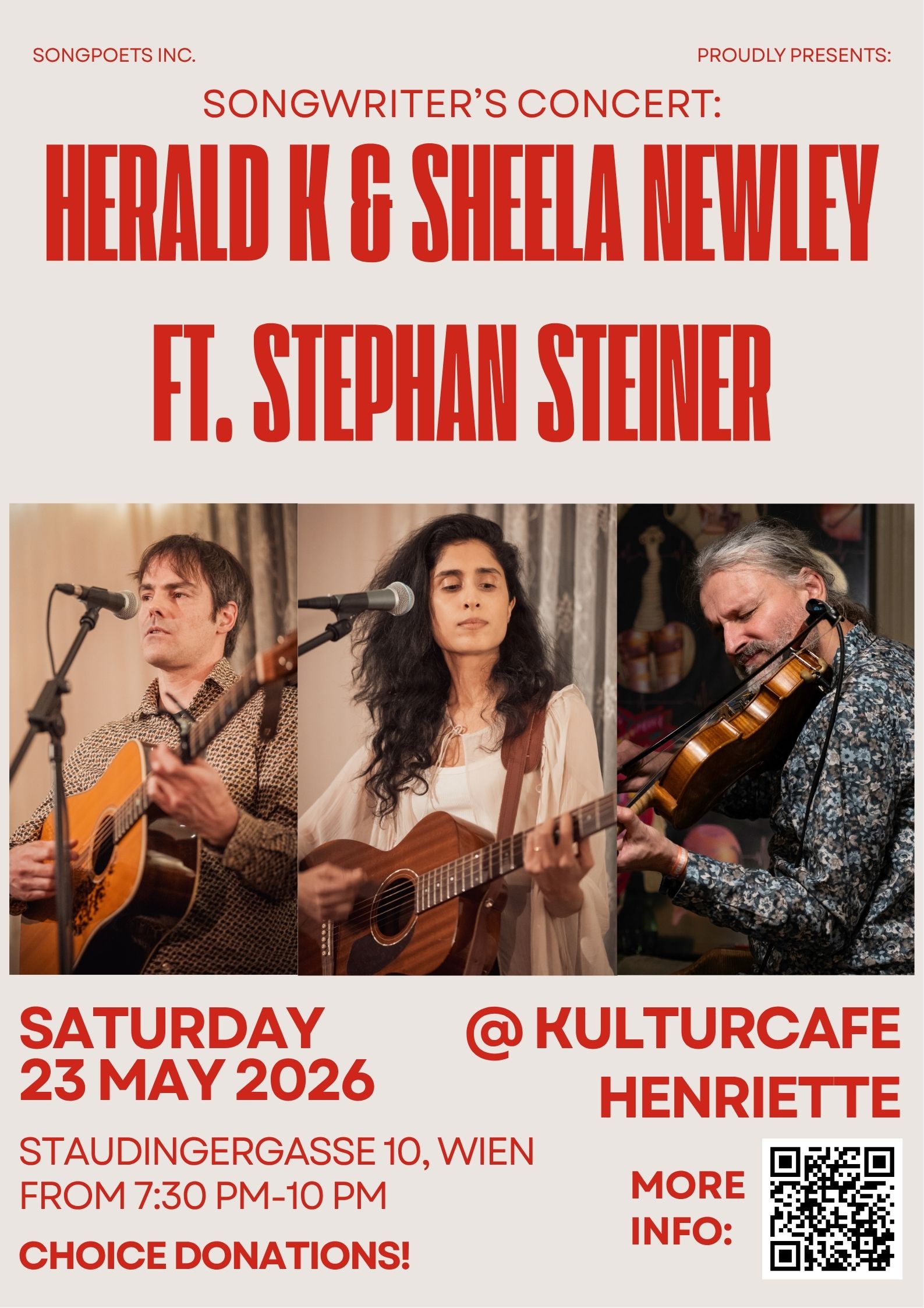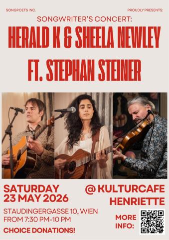 Welcome to a double concert with singer-songwriters SHEELA NEWLEY and HERALD K, both accompanied by multiinstrumentalist Stephan Steiner. Sheela will present her brand new debut single, and the two will play many of their own compositions, mixed with covers by some of their favourite songwriters. And with the date being close to his birthday, do expect the occassional Bob Dylan song on the setlists too! The plan is also to join forces for a couple of duets (!!!).